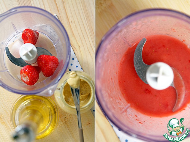 Делаем клубничное пюре, смешиваем его с маслом, горчицей и бальзамическим уксусом (если у вас, как и меня, бальзамик крем, то им просто в конце полейте готовый салат), посолим и приправим перцем по вкусу.