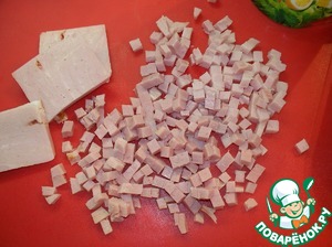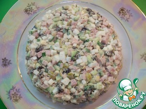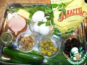 Этот салат имеет приятный вкус. Окорок и сыр интересно дополнены черносливом и оливками. Каперсы и грецкий орех так же добавляют пикантный вкус. Салат понравится любителям мясных закусок.