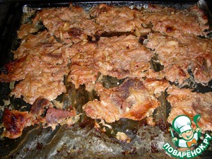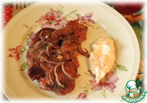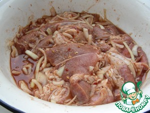Маринад: лук репчатый полукольцами, томатная паста, разведённая в небольшом количестве воды, приправа для гриля. В состав моего маринада входит 50 мг домашней смородиновой наливки и мясо получается очень сладким. Вы можете использовать наливку клюквенную, брусничную, рябиновую. Если не хотите слишком сладкого мяса, можете использовать настойку из ягод. -