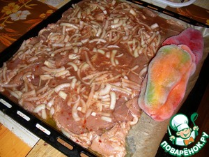 Застилаем пергаментом противень, смазываем растительным маслом, укладываем мясо с луком. С краю кладём сладкий перец для запекания. У меня перец домашний замороженный.