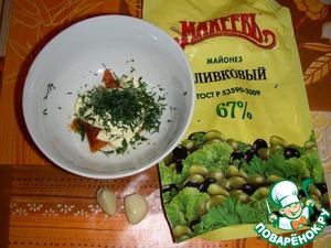 Готовим соус. С охлаждённого перца снимаем кожицу и разминаем мякоть с майонезом "Махеев" оливковый, добавляем мелко нарезанный укроп, 2-3 зубчика чеснока, пропущенных через чеснокодавку.
