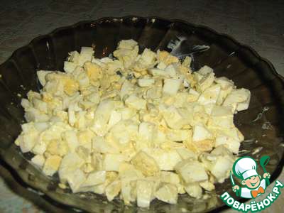 • Яйца отварить и мелко нарезать, поперчить, посолить, добавить ложку майонеза