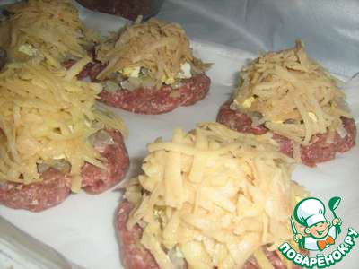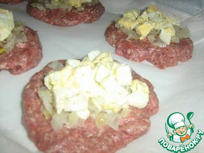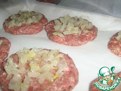 • Сделать из фарша небольшие круглые лепешки диаметром примерно 10 см. Выложить на противень, выстланный бумагой.