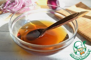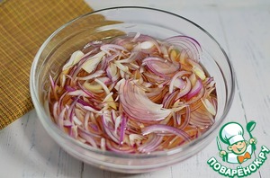 Нарежьте тонкими полукольцами лук и опустите в маринад. Оставьте на 2 часа. Но если у вас нет столько времени, хватит и 15 мин.
