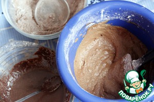 Дальше вводим лопаткой в 3-4 приёма шоколадное молоко и сухие ингредиенты, просеивая их через ситечко в тесто.