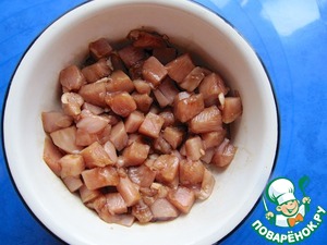Куриное филе нарезать кубиками, замариновать в соевом соусе на 30 минут.