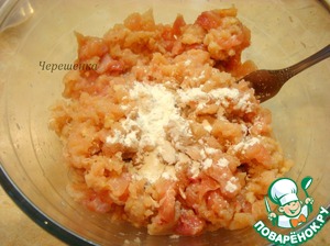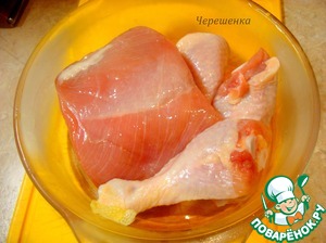 Индейку порезать на крупные куски, посолить, поперчить, добавить мускатный орех, паприку и очищенный чеснок.