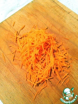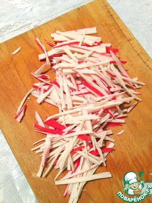 Для достижения оптимального вкусового и визуального результата настоятельно советую соблюдать рекомендации по способу нарезки. Итак, тонкими длинными полосочками нарезаем крабовые палочки.