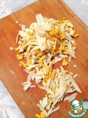 Так же тонкими полосочками нарезаем сваренные вкрутую яйца.