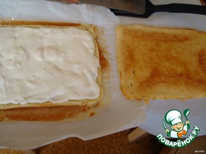 Затем даем остыть, отрезаем по краям и разрезаем 1 раз по горизонтали. Сметану хорошо растираем и смазываем нижний слой,накрываем вторым и режем на квадраты,получается 16-20 шт,в зависимости от формы.