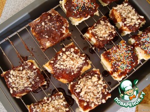 Для глазури: перемешать все ингредиенты в кострюльке,ставим на водяную баню и мешаем пока масса не будет гладкой и блестящей,снимаем с плиты и при помощи двух вилок обмакиваем наши квадратики. Я не стала полность обмакивать, т.к. для меня с лишком сладко получается, поэтому просто полила сверху.