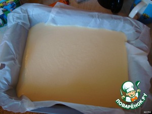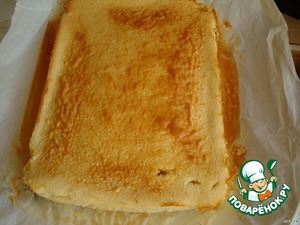 Делаем тесто: всё хорошо перемешиваем и взбиваем в течении 3х минут,выкладываем в квадратную форму, застеленную пергементом, разравниваем и выпекаем в разогретй до 180°С духовке окола 45минут.