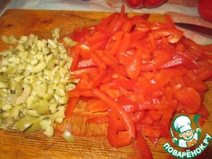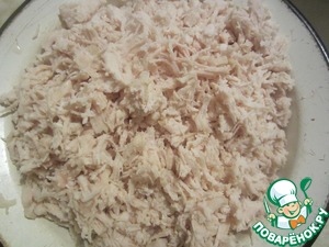 Выложить в салатник слоями, каждый слой промазывая майонезом: куриное филе-шампиньоны-соленый огурец- перец болгарский (несколько полосочек оставить на украшение).