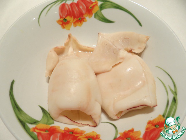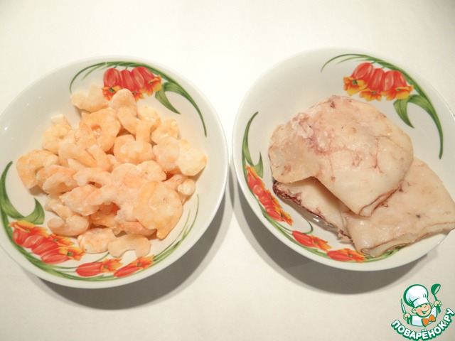 Кальмары и креветки перед приготовлением салата необходимо разморозить, затем кальмары очистить и промыть.