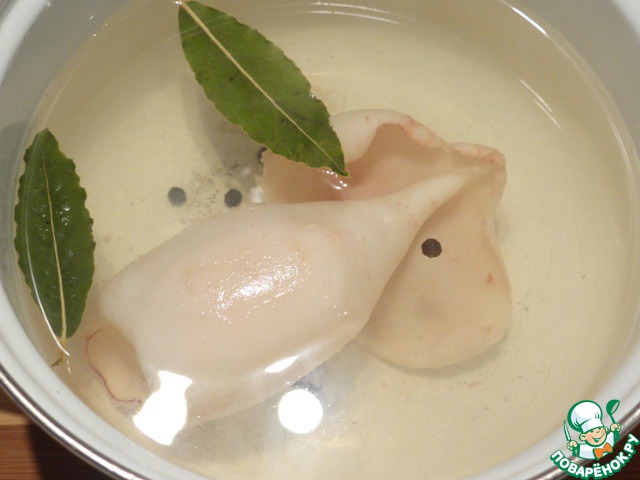 В отдельной кастрюле вскипятите воду. Добавьте в воду соль, лавровый лист, перец горошком. В кипящую воду по одному опускайте кальмары. Сначала опустите один, сосчитайте до десяти и вынимайте кальмар шумовкой.