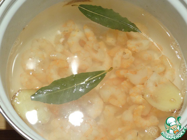 Приготовьте креветки. Сначала вскипятите вод, добавьте соль, лавровый лист и имбирь, прокипятите минуту, добавьте креветки, выключите огонь, закройте кастрюлю крышкой на несколько минут. Потом воду слейте.