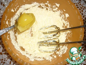 Размягчённый маргарин, сахар, яйцо смешать миксером.