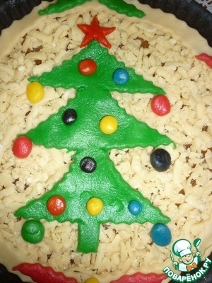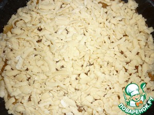 Большую часть раскатать и перенести в форму. Положить начинку. Достать из морозилки шарики и натереть на крупной тёрке поверх повидла.