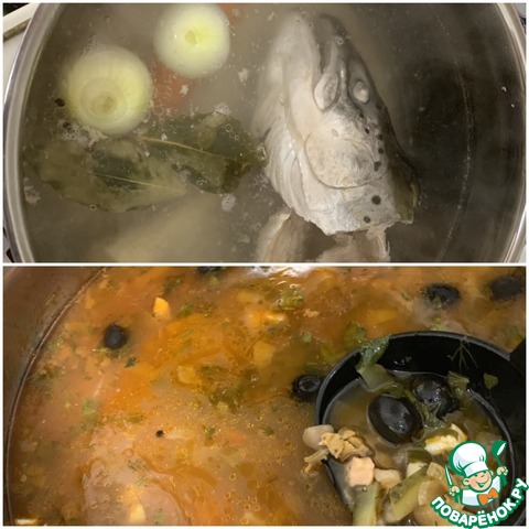 Рыба. Т. е. из бульона-то мы все рыбное убрали и бульон качественно процедили. А коли солянка рыбная, то без рыбы никак.