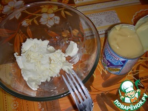 • Готовим крем: взбиваем добела масло сливочное и добавляем сгущенное молоко, охлаждаем.