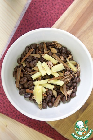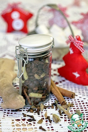 Гвоздику и кардамон мы кидаем в кофе целиком, имбирь и мускатный орех режем или трем на крупной терке, ваниль режем маленькими кусочками, а корицу ломаем, так же на маленькие кусочки. В принципе корицу можно и насыпать измельченную, а палочку положить целиком для красоты)) Все перемешиваем и насыпаем в банку.