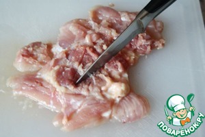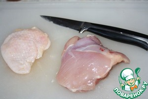 Бедра помыть, обсушить бумажным полотенцем, снять кожу и срезать лишний жир. -