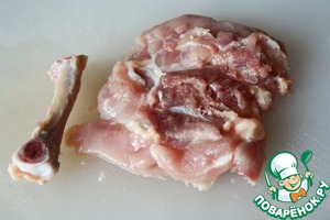 Аккуратно вырезать косточку и отбить молоточком мясо, без фанатизма, только самые утолщенные места. Отбиваем только с одной стороны.