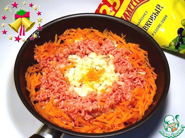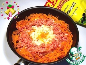 Обжарьте фарш на сковороде с луком и морковью, добавьте порубленный мелко чеснок и приправу (если нет, то посолить и поперчить). -