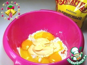 Замесите тесто из яиц, майонеза, муки и сметаны. Получается жидкое тесто.