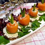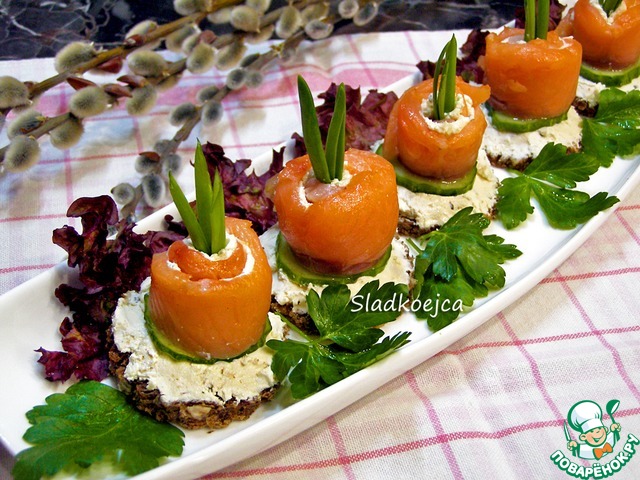 Эта закуска произвела фурор! Но я немного упростила: просто свернула кусочки семги конусом и скрепила зубочисткой.Хлеб брала литовский.