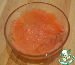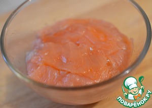 Семгу нарезать тонкими ломтиками и выстлать дно и стенки небольшой порционной пиалы.