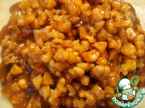 • Пока наше тесто охлаждается, займемся начинкой. Для этого грецкие орехи крупно порубить.