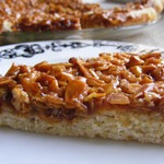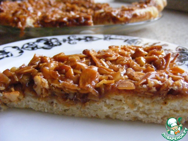 Итак, раскатанное тесто выложить в форму, сверху смазать конфитюром (или вареньем без ягод) и распределить ореховую начинку.