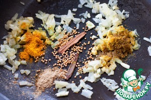 На другой сковороде раскалить 2 ст. л. растительного масла, обжарить лук и чеснок, потом добавить специи и готовить, помешивая, еще 2-3 минуты