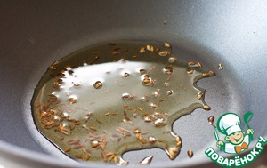 В сотейнике или на сковороде с толстым дном разогреть 2 ст. л. растительного масла и обжарить зиру до появления яркого аромата.