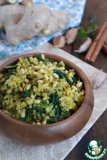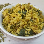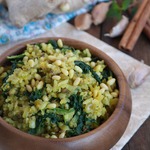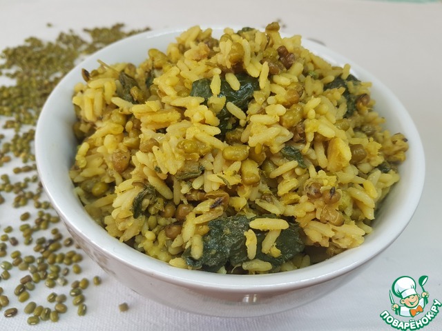 К рису и машу добавить специи со сковороды, перемешать, закрыть крышкой и готовить, пока рис не станет мягким. Добавить шпинат. Если шпинат замороженный, "закопать" его в рис, закрыть сковороду крышкой и подождать минут 5, пока он не оттает. Снять с огня. Если шпинат свежий, добавить, перемешать, накрыть крышкой и снять с оня.