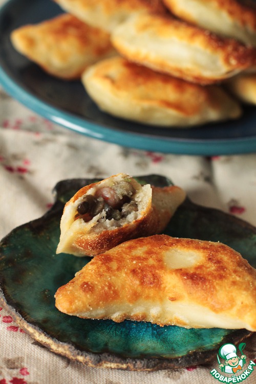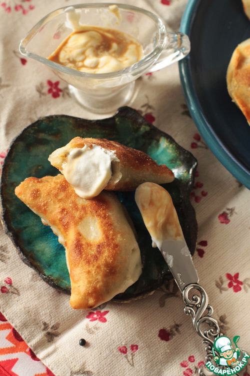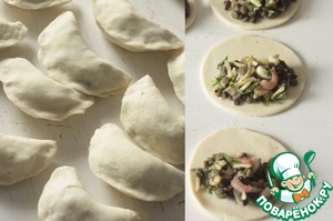Раскатайте тесто, вырежьте круг, на одно половину выкладывайте начинку и закрывайте другой половиной.