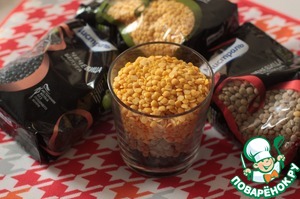 Я использовала 3 вида чечевицы - черная и зеленая (они сохраняют свою форму при варке) и желтая, она разваривается и соединяет чечевицу вместе. Всю чечевицу промыть, выложить в кастрюлю и залить водой 1:2, варить 15 минут. -