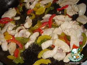 добавить куриное филе, порезанное кусочками и жарить 2-3 мин