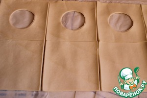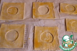 Развернем готовое слоеное тесто. Разрежем на квадраты 10 на 10 см, нам нужно парное число. В половине квадратов вырежем рюмкой серединку.