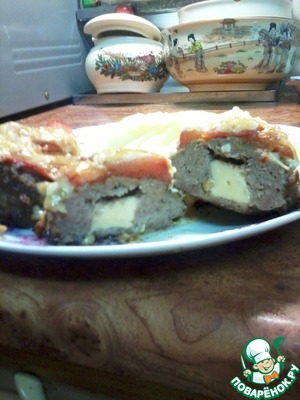 Мокрыми руками сформировать шарик из фарша, размять его, придав форму круга. В центр положить сыр, а на сыр - масло. Края защипнуть.