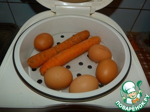 ... а на чаше контейнер-пароварка с морковкой и яйцами