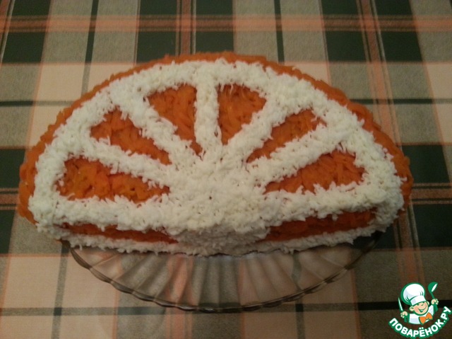 Осталось только натертым белком салату придать окончательный вид апельсиновой дольки.