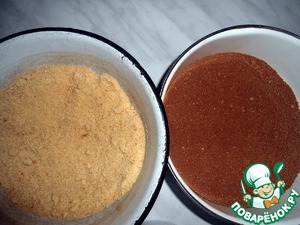 Печенье типа "Юбилейного" смолоть в блендере до состояния крошки. Разделить на две части. Одну часть я сделала немного поменьше (это не обязательно, можно в равных пропорциях-не принципиально).