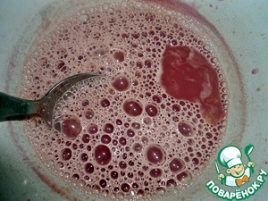 Теперь займемся кремом. Из этого будет сделана шуба деда мороза. В кастрюльку наливаем... и тут... что у вас имеется в красном виде (компот из черной смородины, из вишни, из винограда, из черноплодной рябины, либо сок такого оттенка) Я же использовала чай каркаде. Заварила очень крепко. Его мне понадобилось полкружки.