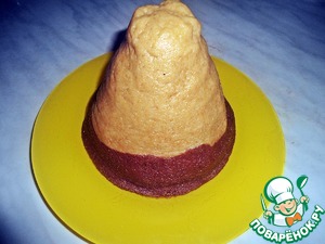 Достаем из холодильника наше "тесто", лепим из него конус. Обратите внимание, темный слой внизу. Оставляем от него небольшой кусочек для глазок.