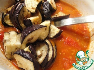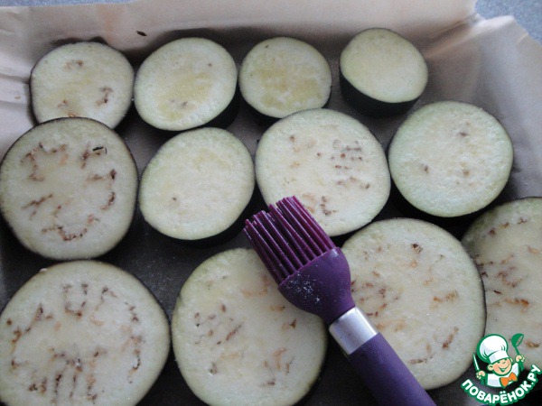 • Для начала баклажаны нарезать кружочками. Выложить на противень, смазать растительным маслом и запечь минут 20, до готовности. Слегка посолить