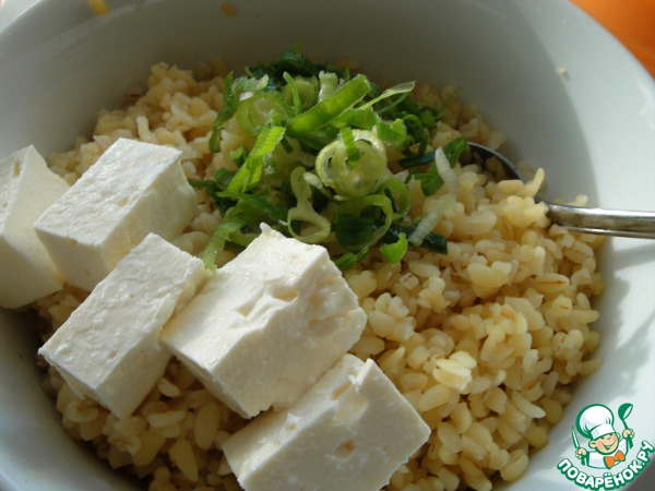 • Зеленый лучок и фету нарезать и перемешать с булгуром.