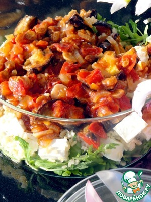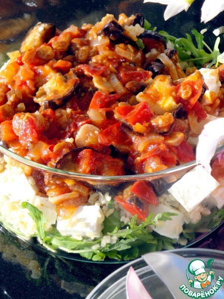 • Рукколу выложить в салатник. Поверх выложить булгур и баклажаны с соусом.