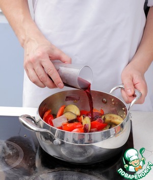 Влить красное вино, довести до кипения. Уменьшить огонь, кастрюлю неплотно накрыть крышкой и готовить 20 мин.
